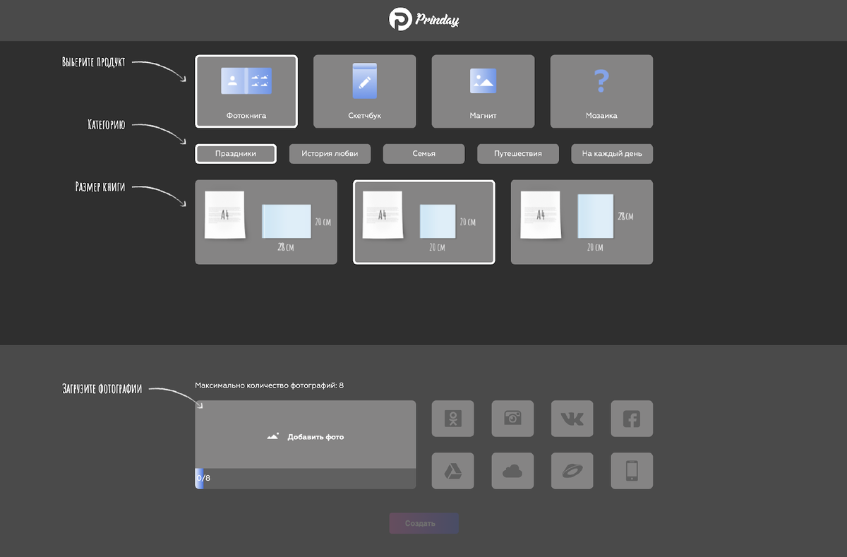 Что касается цен на фотокниги, опять же, есть возможность самостоятельно регулировать цену уже в процессе работы. На страничке есть специальный ползунок, который позволяет увеличить или уменьшить цену книги, а в результате, автоматически увеличивается или уменьшается объем самой фотокниги. Еще одна уникальная возможность – вы можете использовать фильтры и убирать дефекты на фотографиях, когда они уже размещены на страницах будущей фотокниги, то есть, прямо в процессе работы в сервисе компании, не отвлекаясь на другие ресурсы. В общем, все нужные инструменты у вас под рукой. Сервис компании PrinDay работает с любыми социальными сетями, причем, скачивать фото самостоятельно не надо, просто вставьте ссылку на свою страничку и все фото разместятся в вашей фотокниге.